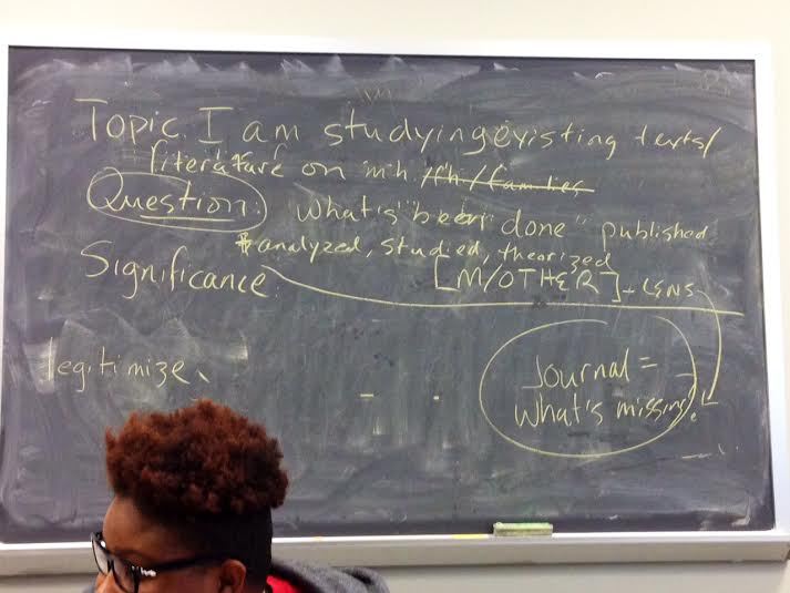 I presented my paper called “Digital Humanities Gives Birth to Mother Studies in the Academy.” This is what the blackboard looked like after my presentation. Class participants were eager to help me, but there was a great deal of confusion on where to begin? This is what I think the class was trying to say to me: