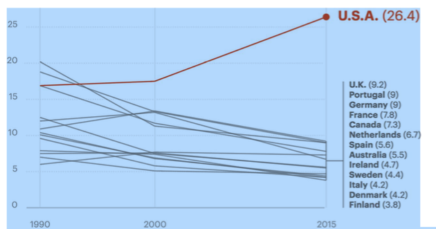 In the United States, 26.4 out of 100,000 women die in childbirth every year (Kassebaum et al, 2016, as cited in The Lancet 388(10053). As can be seen in the chart below, we are the only country out of 13 other industrialized nations with a rising maternal death rate (i.e. death from pregnancy-related complications) (Kassebaum, et al, 2016).