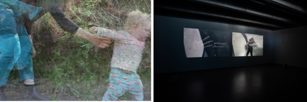 Frequently, the language of the text (“holding, carrying, rocking”…) is performed by the woman in the quad. The audio text refers to the site in which the women have gathered, the same site in which audiences watch the dual films as children play in the background. There is a sense of secrecy conveyed through the voiceover of mother’s voices: “Nobody really saw us,” of the site providing a sanctuary for the mothers and children to gather; “We were enclosed by the space” (Matrescence, 01:30).