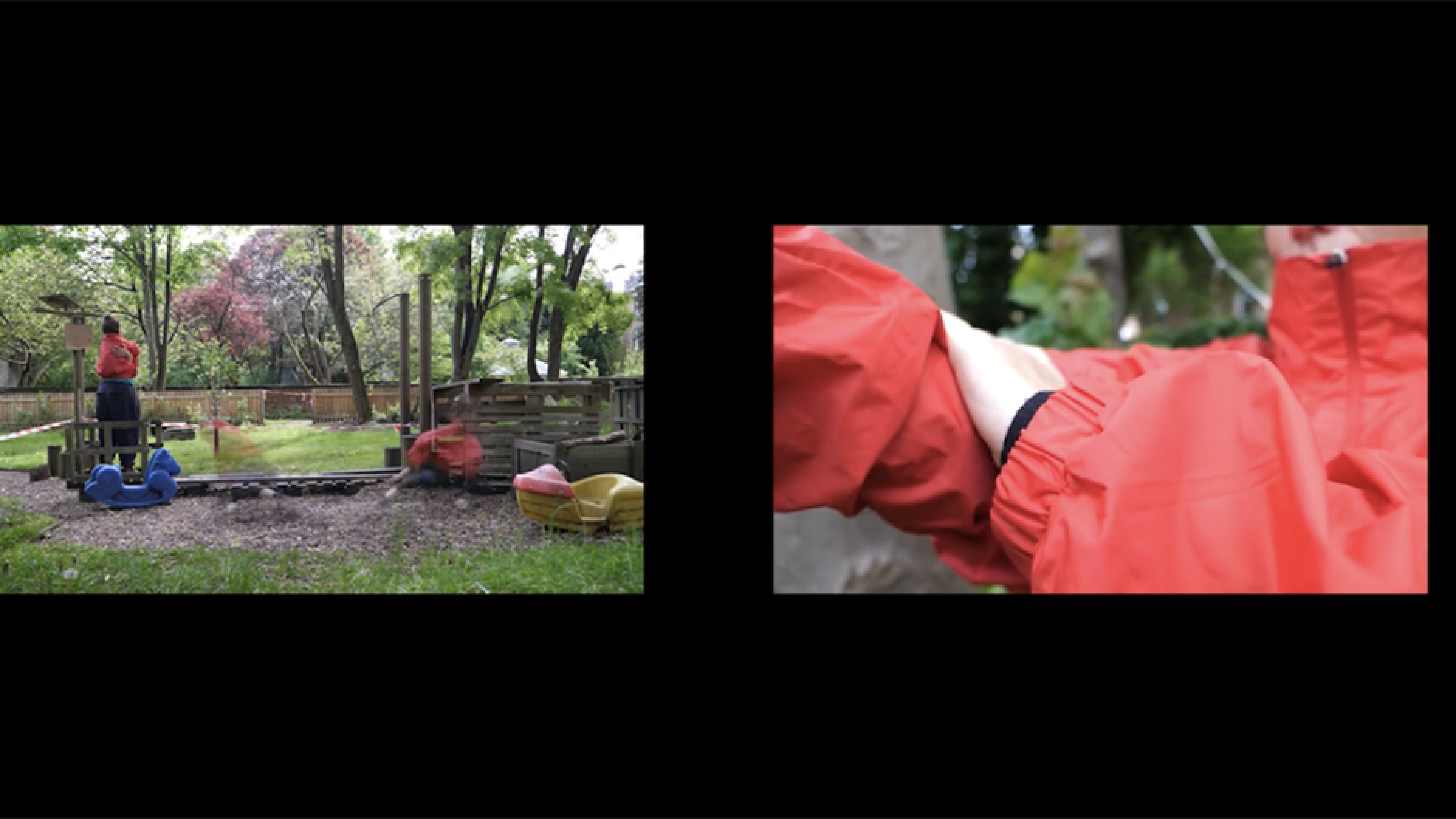 In her chapter “Pregnant embodiment: Subjectivity and alienation,” Young conceives of pregnancy as a condition in which the mother is doubled in both her subjectivity and her experience of time (2005 [1990]). This sense of a split between Quinn’s “I-was” and “I-am,” and the liminality of this experience, is further explored through Smekot’s camera work. The multiplicity of angles and perspectives on the site, the foliage, the undergrowth, the trees and bins are frequently seen through gaps in the wooden structures built for the children to play on. Structures are rickety, and the piles of bricks precarious.